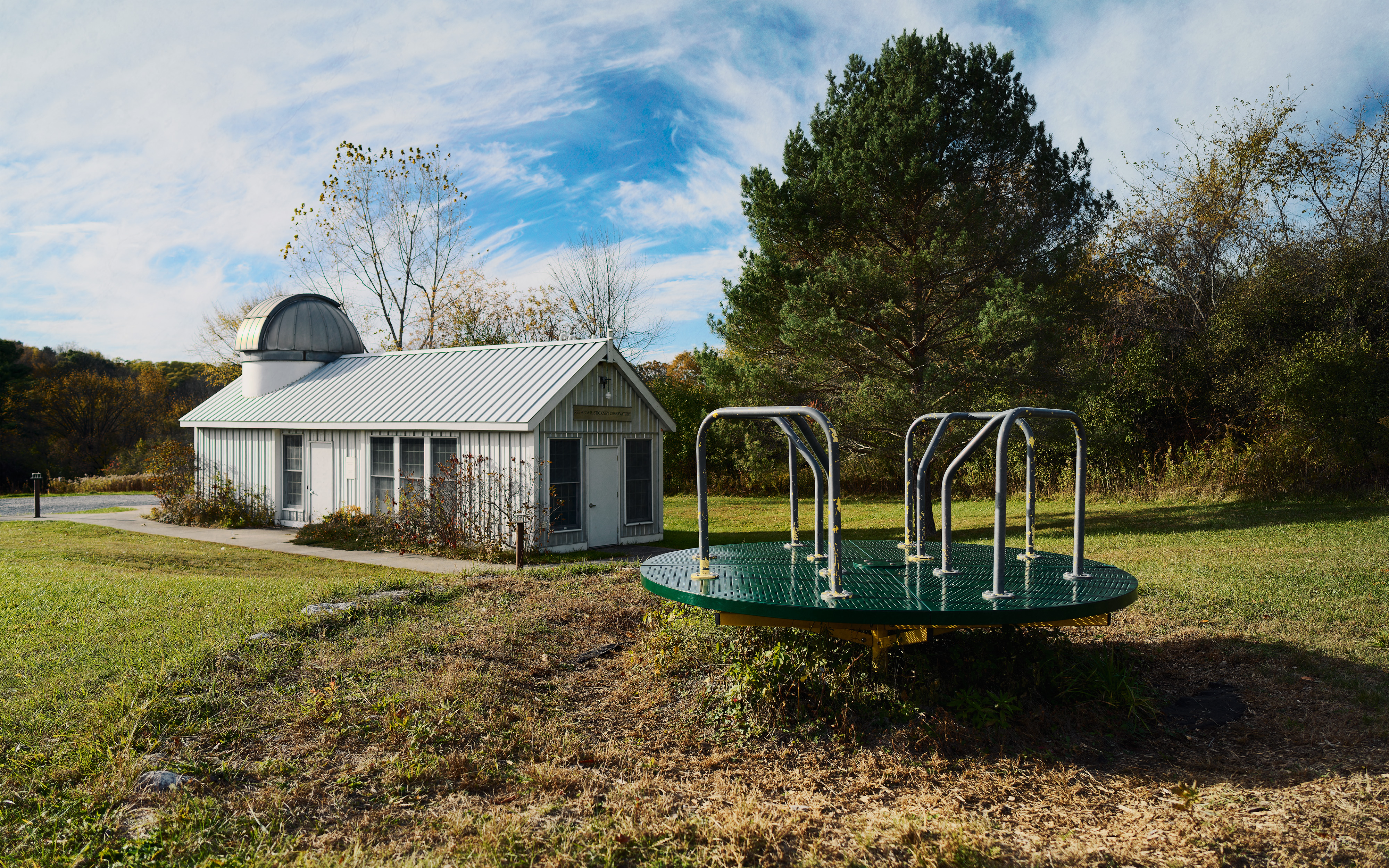 in a bucolic Vermont setting, a small metal clad building with a little cupola on the end for a telescope. Foreground: merry go round.