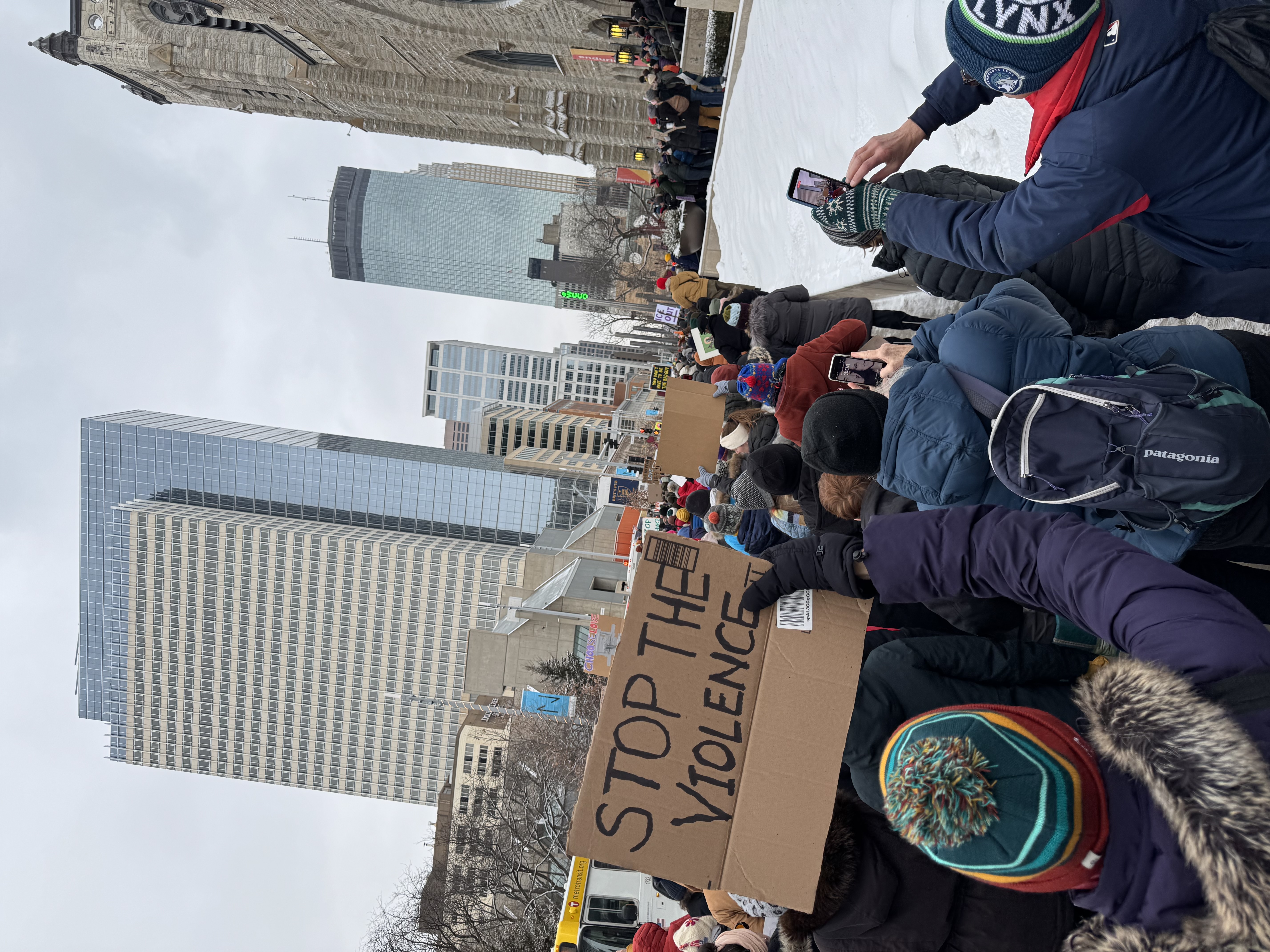 A photo of singing protesters in downtown Minneapolis. The top of the image shows some skyscrapers. On the right is part of the Westminster Presbyterian Church where we started. The protesters line the whole block. In the foreground is a sign that reads "Stop the Violence"