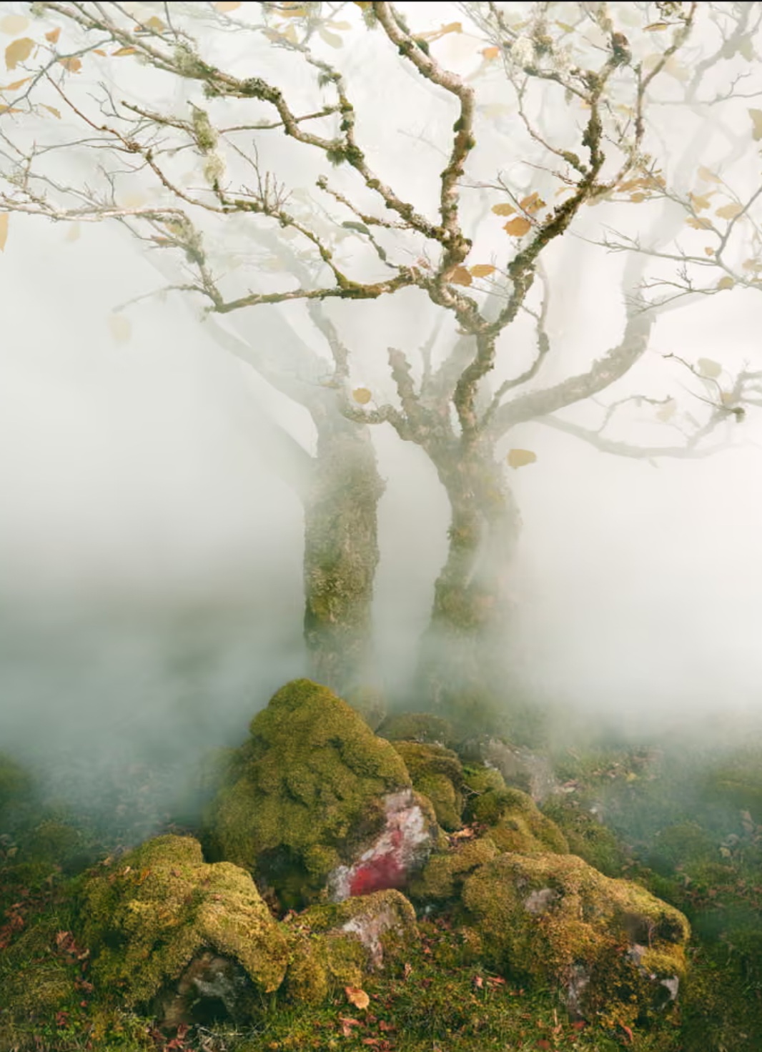 Color portrait of landscape on the Isle Of Skye. Expressive trees in mist, mossy rocks, with a mysterious red stone face. Called A Fairy Glen.