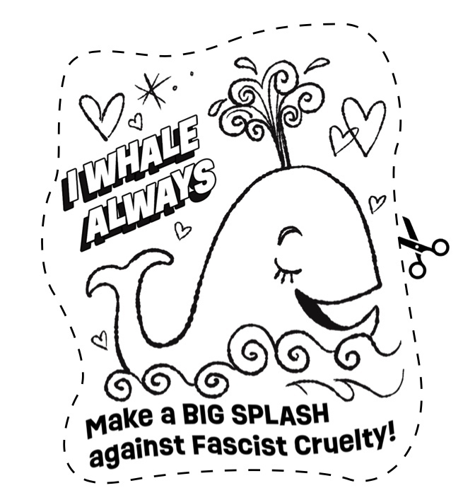 The illustration is of a whale spouting water. It is floating on the waves, smiling, and it has long eyelashes. There are sparkles and hearts floating in the background. The text says "I whale always make a big splash against fascist cruelty!"