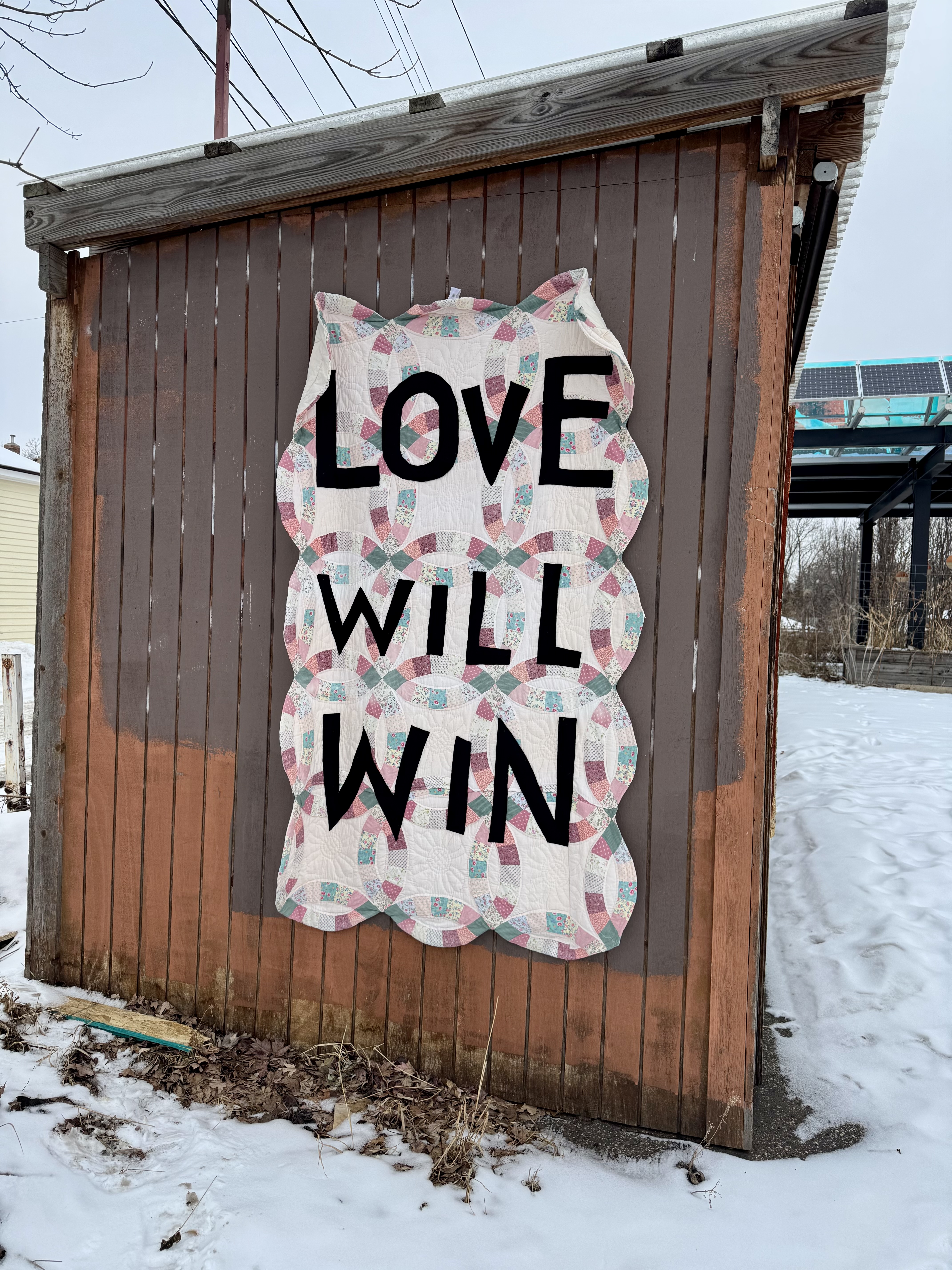 A quilt with the words "Love Will Win" stitched on top in black. The quilt itselft is light beige with interlocking circles made of various fabrics in pink, green, mauve and similar colors. The quilt hangs on the side of a shed that is mostly light brown, but has darker brown where graffiti, presumably, was covered up.