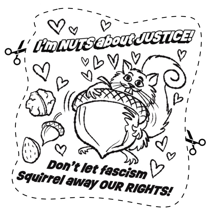 The illustration shows a squirrel looking at the viewer. It is holding a comically large acorn, and there are nuts and hearts in the background. The text reads "I'm nuts about justice! Don't let fascism squirrel away our rights!"