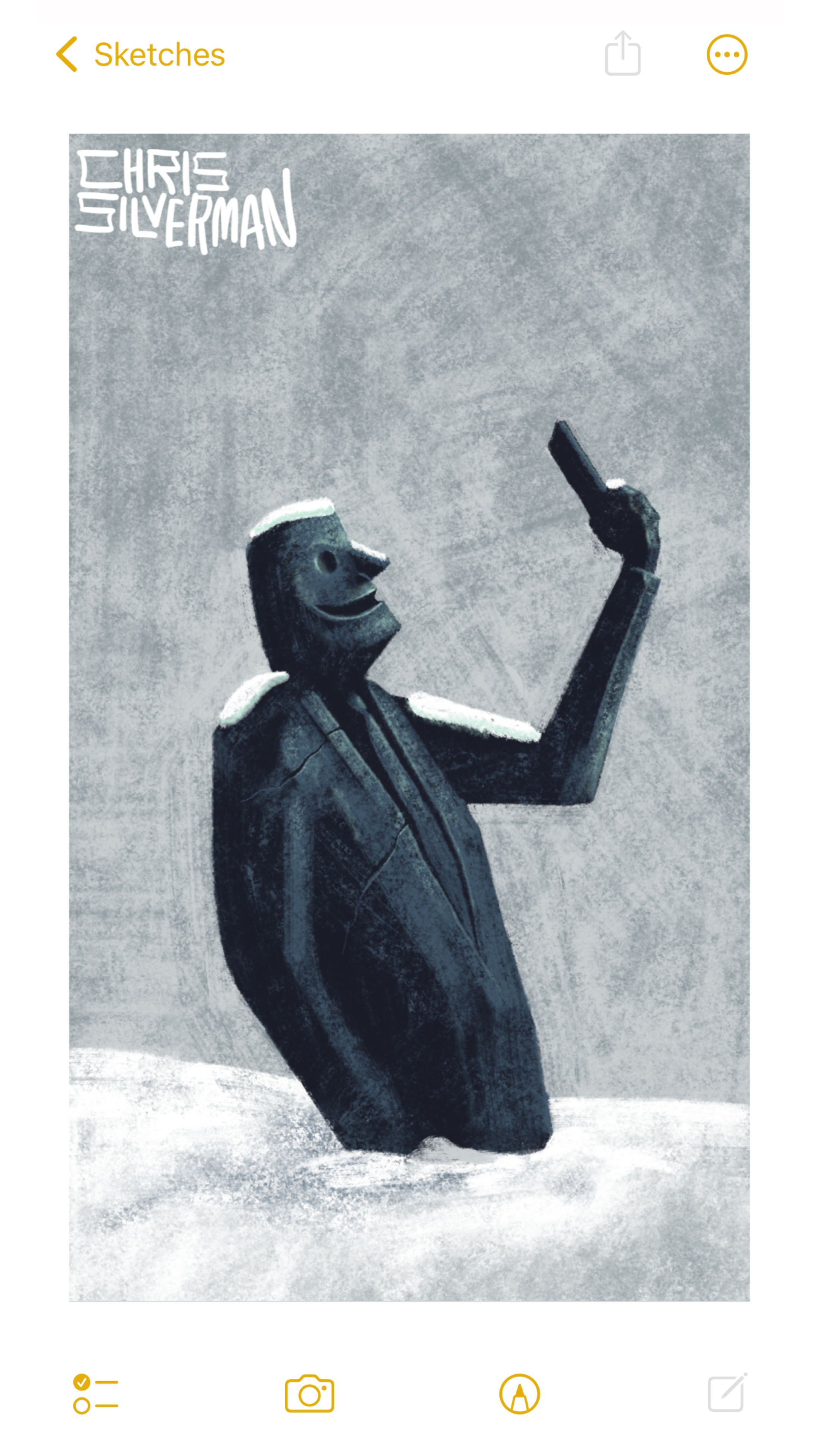 A gray, stone statue wearing a suit and tie stands waist deep in the snow under a gray sky. The statue is partly covered with snow, and has a few small cracks in it. It is taking a selfie, holding its stone phone up in front of its face and smiling. The painting is signed "Chris Silverman".