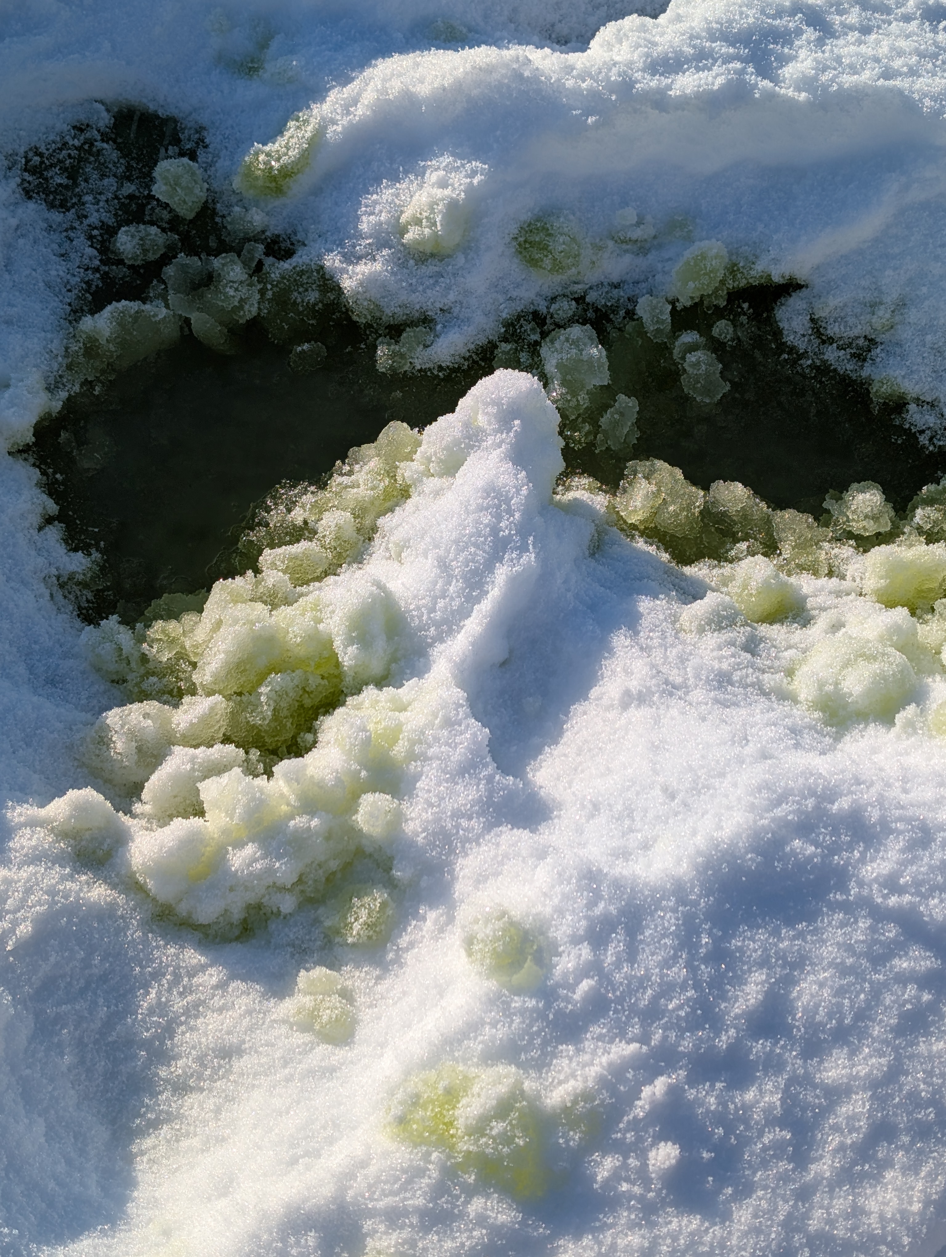 powdery snow covers the surface of a frozen pond. it has been scraped away in places and underneath is wet green (algae-filled?) slush. There doesn't appear to be any solid ice underneath