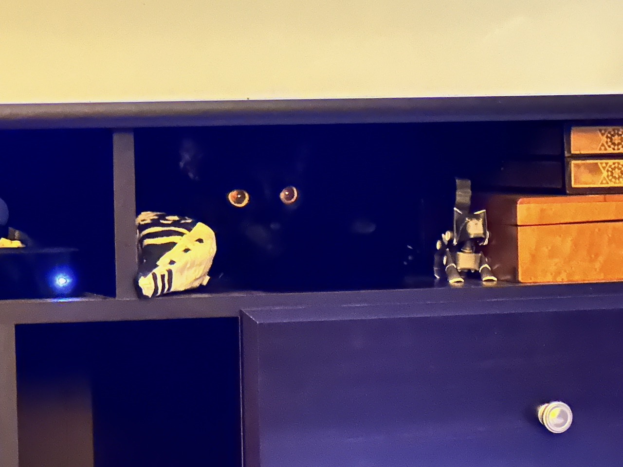A close up of a tv entertainment console with two glowing yellow eyes peering out from the darkness of one of its shelves.