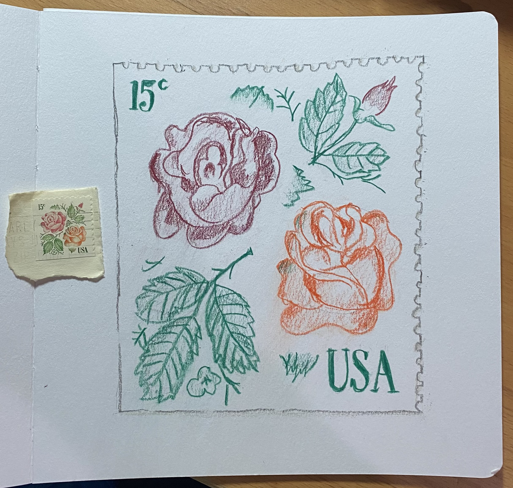 Colored pencil sketch of a stamp. This one has 15c in the upper left and USA in the bottom right. In the middle are a couple of flowers (one orange, one purple) with some green leaves places around the flowers.