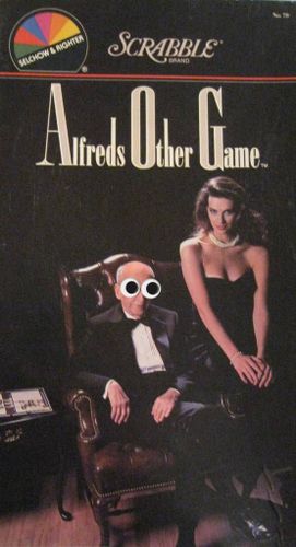 the game box for "Alfreds Other Game" [sic], showing an elderly man (Alfred Butts, creator of Scrabble) wearing formal evening attire while sitting in a brown leather high-backed chair. A young woman is perched on the arm of the chair.
