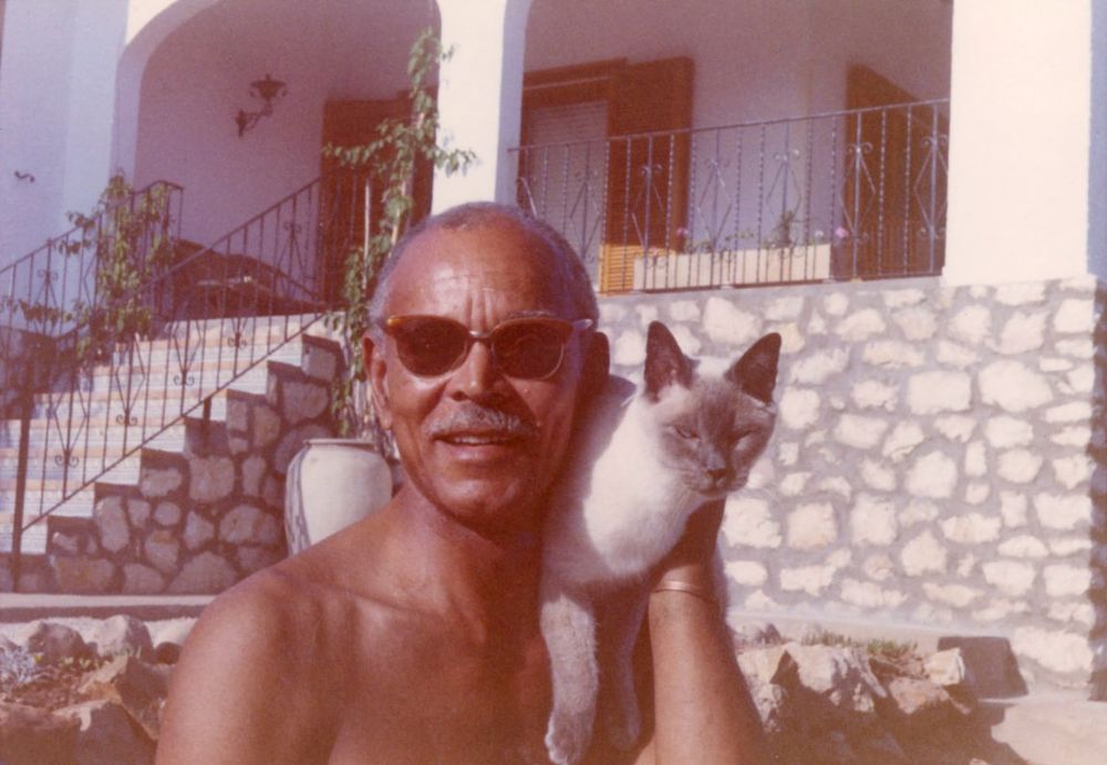 A somewhat washed out color photograph, possibly a Polaroid. An older Black man, shirtless and wearing sunglasses, with a gray mustache and receding gray hair cut short, is standing on a sunny day outside a white building (a house or possibly an apartment complex) with stone stairs. On his shoulder is a Siamese cat, looking at the camera. The cat is a beautiful baby but looks irritated.