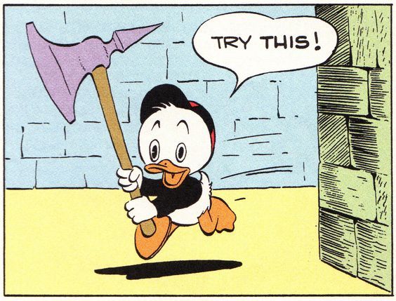 screenshot of Huey Duck in a cartoon running around a corner holding an axe larger than he is while yelling, "Try this!"