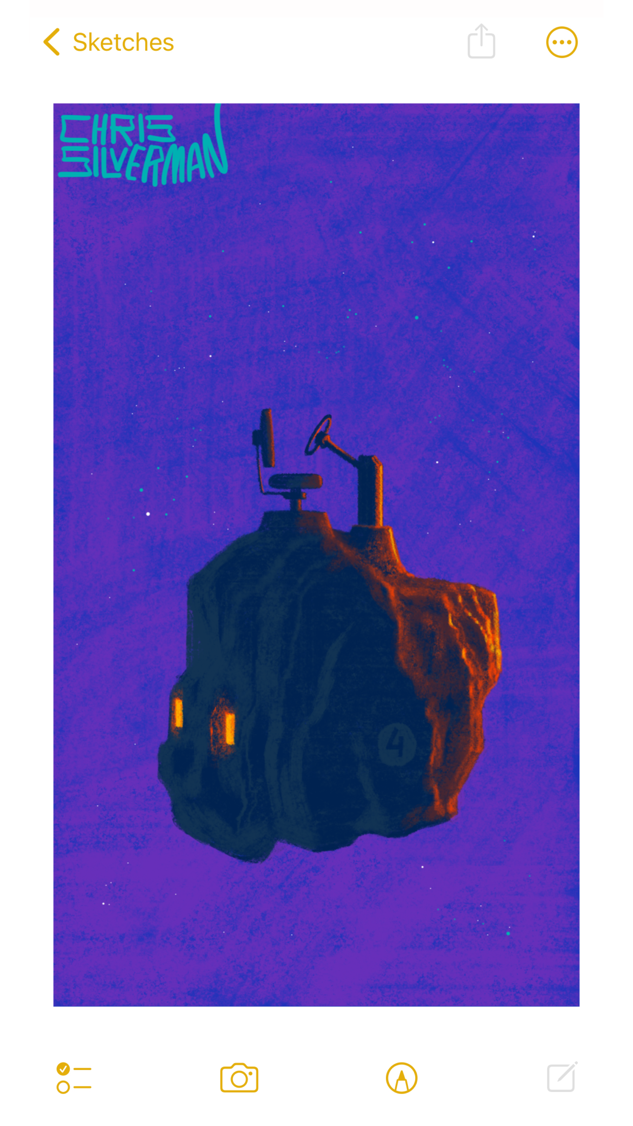 A small asteroid floats in the starry indigo expanse of deep space. Somewhat unusually, the asteroid has a tractor-style seat, a steering wheel, and red taillights. There's no sign of a driver. The front of the asteroid is illuminated with red light, as though catching sunlight from an unseen star. Stenciled on the side of the asteroid, as though it belongs to a fleet, is the number 4 inside a gray circle. The painting is signed "Chris Silverman".