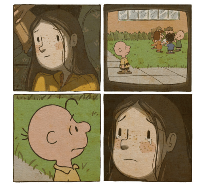 four-panel color comic. Panel 1, a young person with long brown hair, in a dimly lit space, seems absorbed by something they're watching. Panel 2, a cathode ray tube TV screen showing Charlie Brown appearing alienated from a circle of peers outside. Panel 3, close-up of Charlie Brown looking stricken. Panel 4, close-up of long-haired young person, their eyes welling with tears.