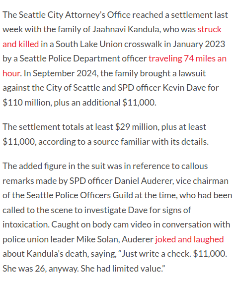 The added figure in the suit was in reference to callous remarks made by SPD officer Daniel Auderer, vice chairman of the Seattle Police Officers Guild at the time, who had been called to the scene to investigate Dave for signs of intoxication. Caught on body cam video in conversation with police union leader Mike Solan, Auderer joked and laughed about Kandula’s death, saying, “Just write a check. $11,000. She was 26, anyway. She had limited value.”