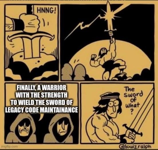 One of the hooded figures says "Finally, a warrior with the strength to wield the sword of legacy code maintenance"