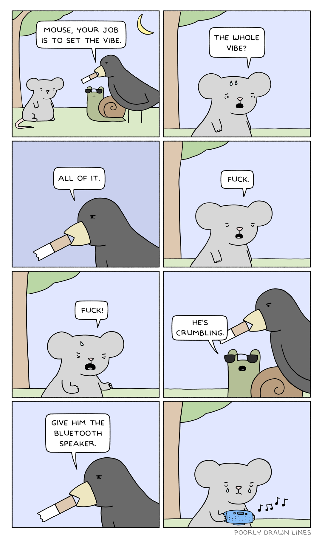 Mouse now has a bluetooth speaker playing music in his hands while tears go down his cheeks.