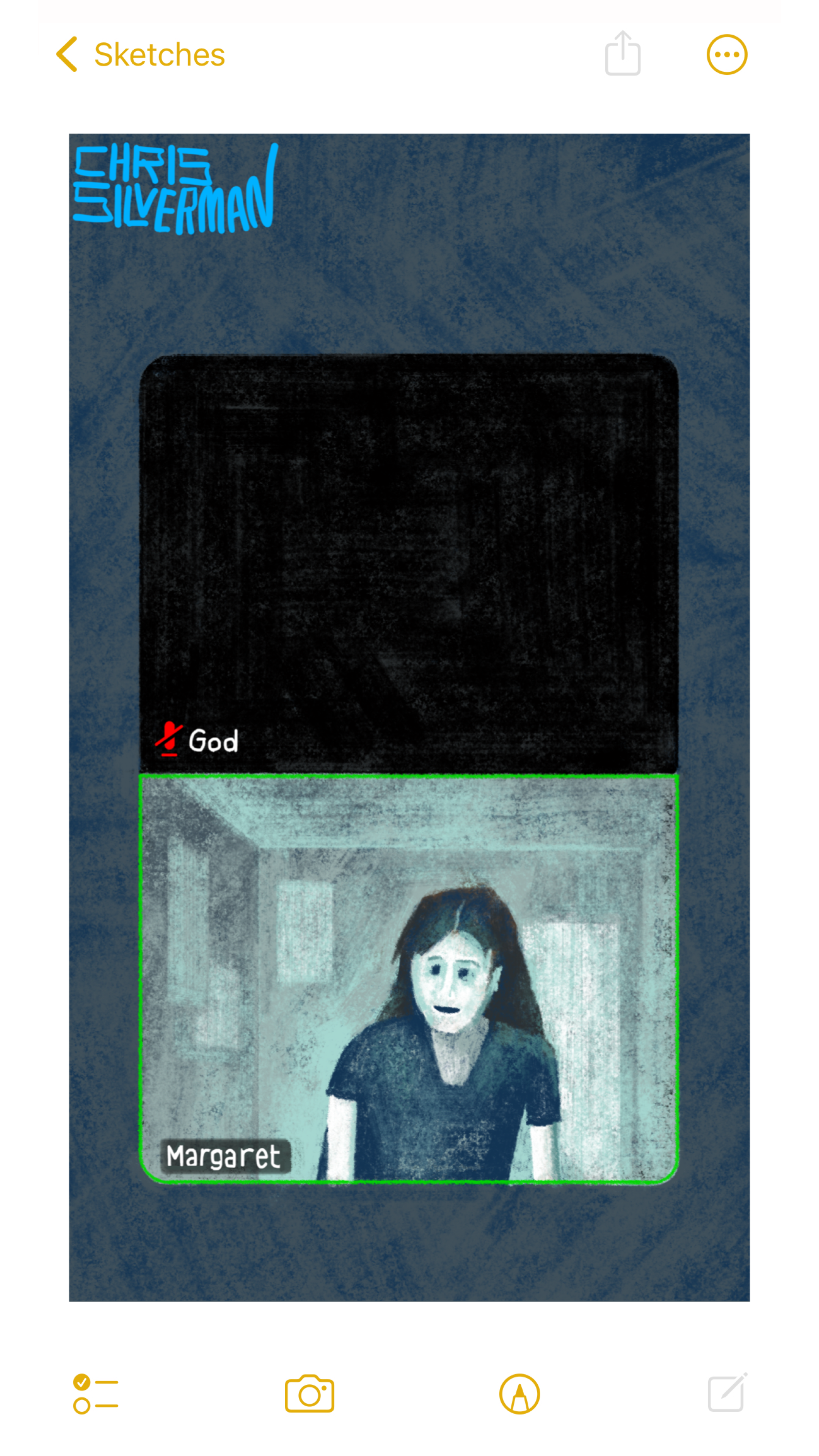 The view from a Zoom meeting: a dark gray background with two people in the meeting. The video screens are stacked one on the other. The upper person's video screen is completely black, with a small, red crossed-out-microphone icon that indicates they are muted. The label on the screen says "God" in small, white letters. The lower video screen shows a girl with long dark hair and a dark short-sleeved shirt. She is in a small room with a few dimly visible posters on the wall. The entire scene is rendered in shades of pale blue that suggest a dark room lit only by a computer screen. Her name is displayed as "Margaret", and there is a green border around her video screen, indicating that she is speaking. Someone familiar with classic children's novels will recognize this as a reference to the book "Are You There God? It's Me, Margaret", by Judy Blume, whose birthday is today. The painting is signed "Chris Silverman".