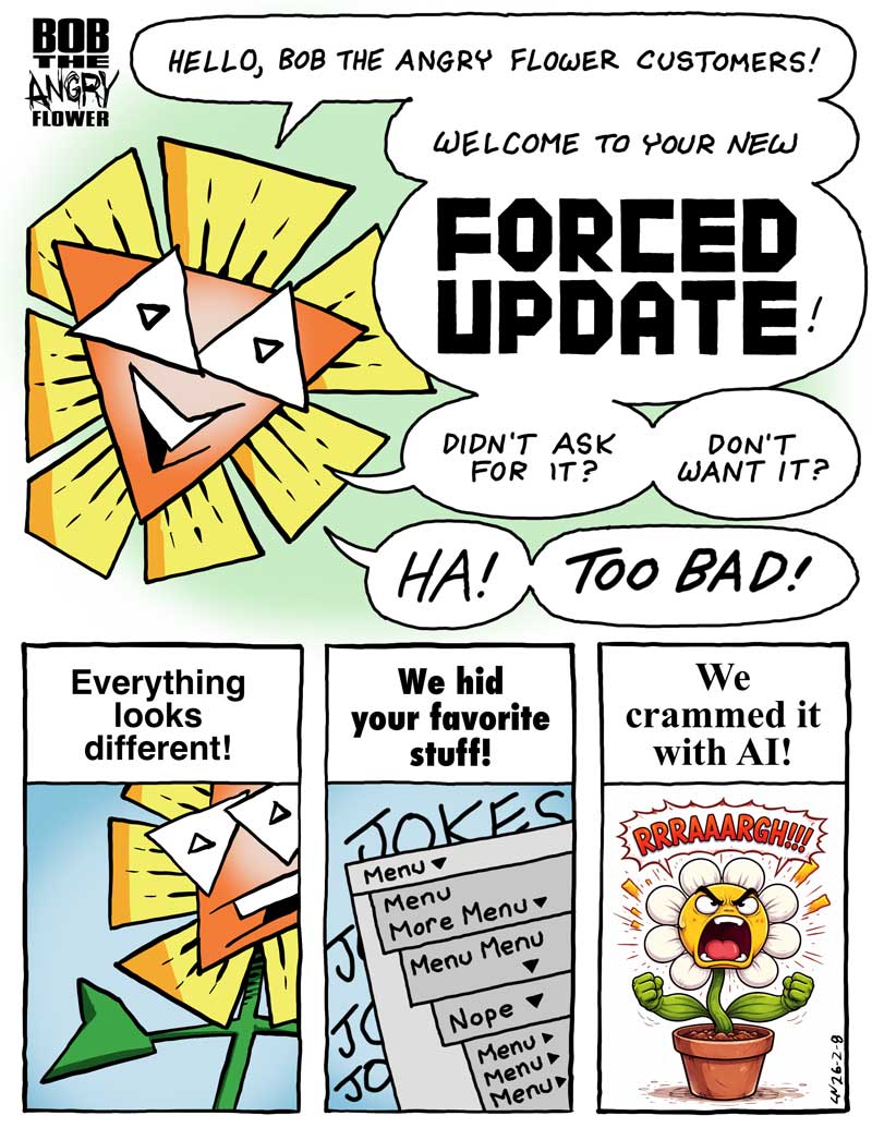 "Hello, Bob the Angry Flower customers! Welcome to your new FORCED UPDATE! Didn't ask for it? Don't want it? Ha! Too bad!"