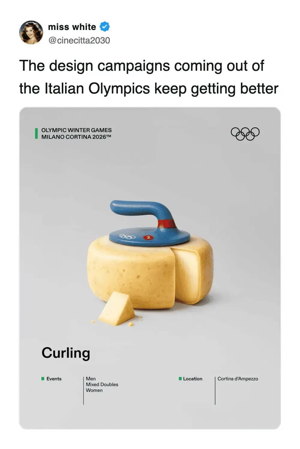 Is this a one-off or part of a series? It doesn't have any of the branding developed for the '26 winter games so my charitable read is it's somebody unaffiliated, having fun with the imagery.