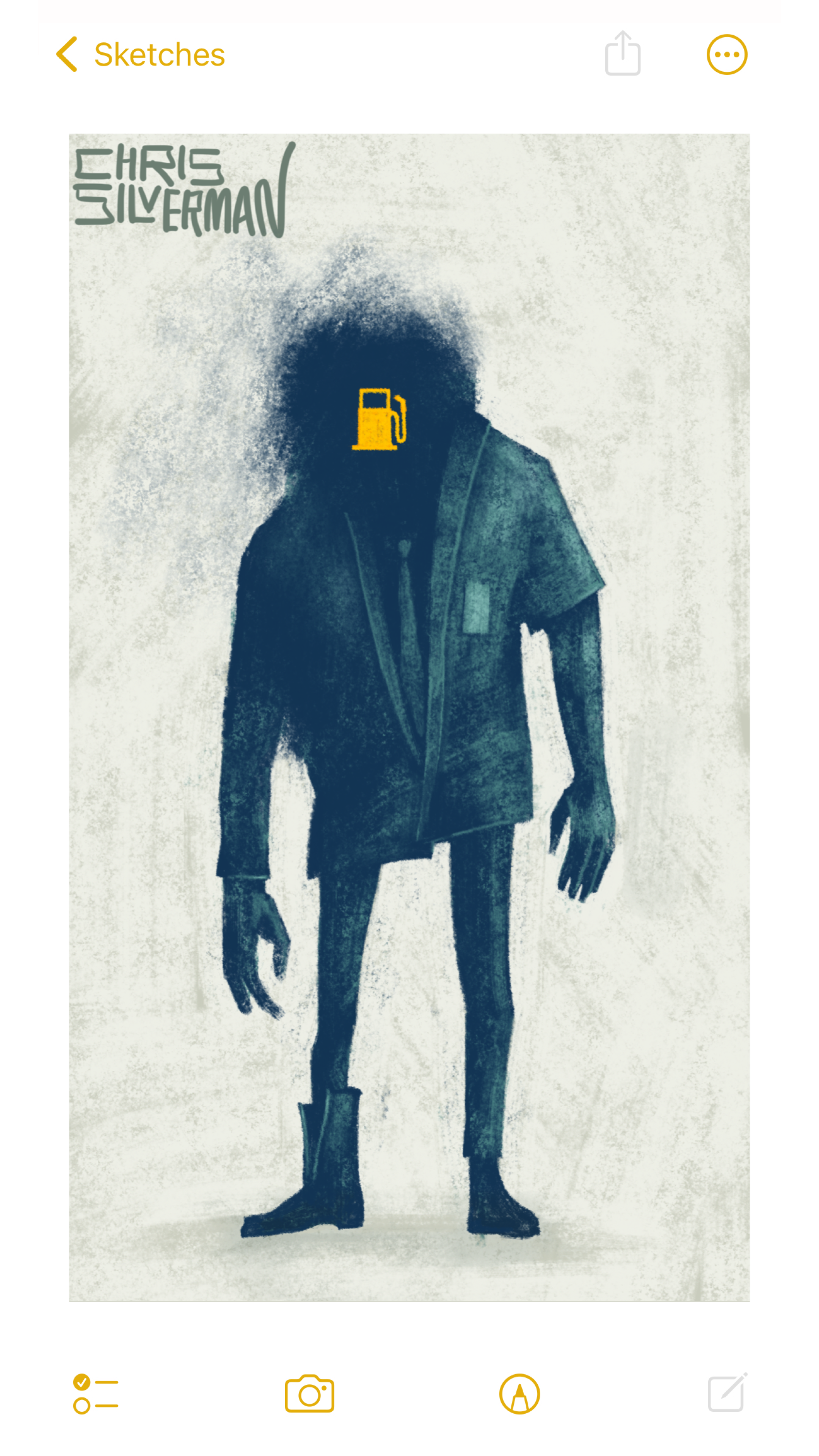 A strange and disturbing figure, rendered entirely in dark, dull, monochromatic blue-green against a pale tan background. The figure is lurching forward, the way a zombie would, arms hanging down. One arm is longer than the other. Its legs are oddly thin compared to its upper body. It is wearing a suit coat and tie, but the left arm of the coat is short, like a short-sleeved shirt, and the left side of the coat is higher than the right. Also pinned to the left breast of the coat is what looks like an ID card, although whatever is printed on it is not visible. The figure wears mismatched boots, one of which is open, and appears generally dysfunctional. Where its head would be is a shapeless black smudge; a void that looks like a large ink blot. At the center of the void is a small orange icon of a gas pump—the icon a car displays when it is close to running out of fuel. The painting is signed "Chris Silverman".