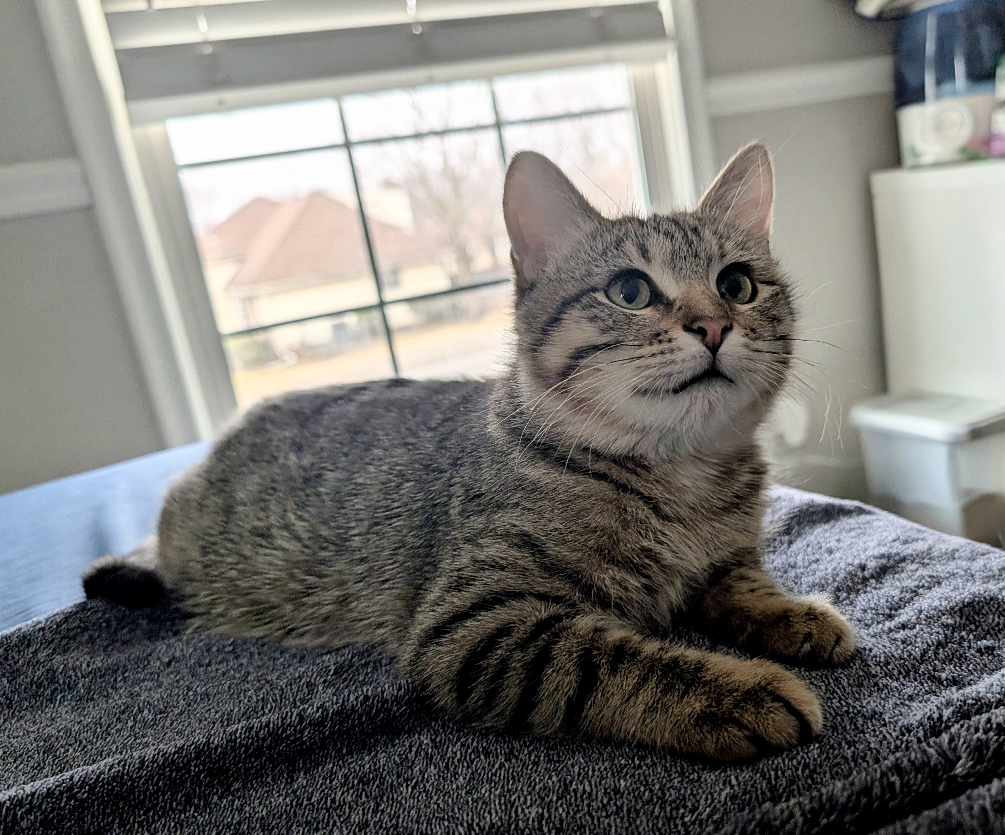 On new year's eve Krypto began to act listless and stopped eating. In the morning, I saw he was trying to use the litter box, but couldn't. So on new year's day, we were at an emergency vet hospital fearing a bowel obstruction. They did X-rays and blood work but found no obstruction or reason for him to be struggling to keep things moving. They offered to keep him overnight for a couple thousand dollars to monitor him. I took him home and to my regular vet first thing the next morning. An enema and some more X-rays and more blood tests and a couple of vaccinations later, he was limping a lot from the blood draws and from a very big poop from a little kitten.