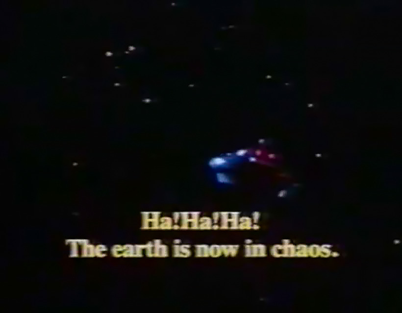 Screencap of a TV show; in the blackness of space, a small ship hurtles past the stars. A caption reads, "Ha!Ha!Ha! The earth is now in chaos."
