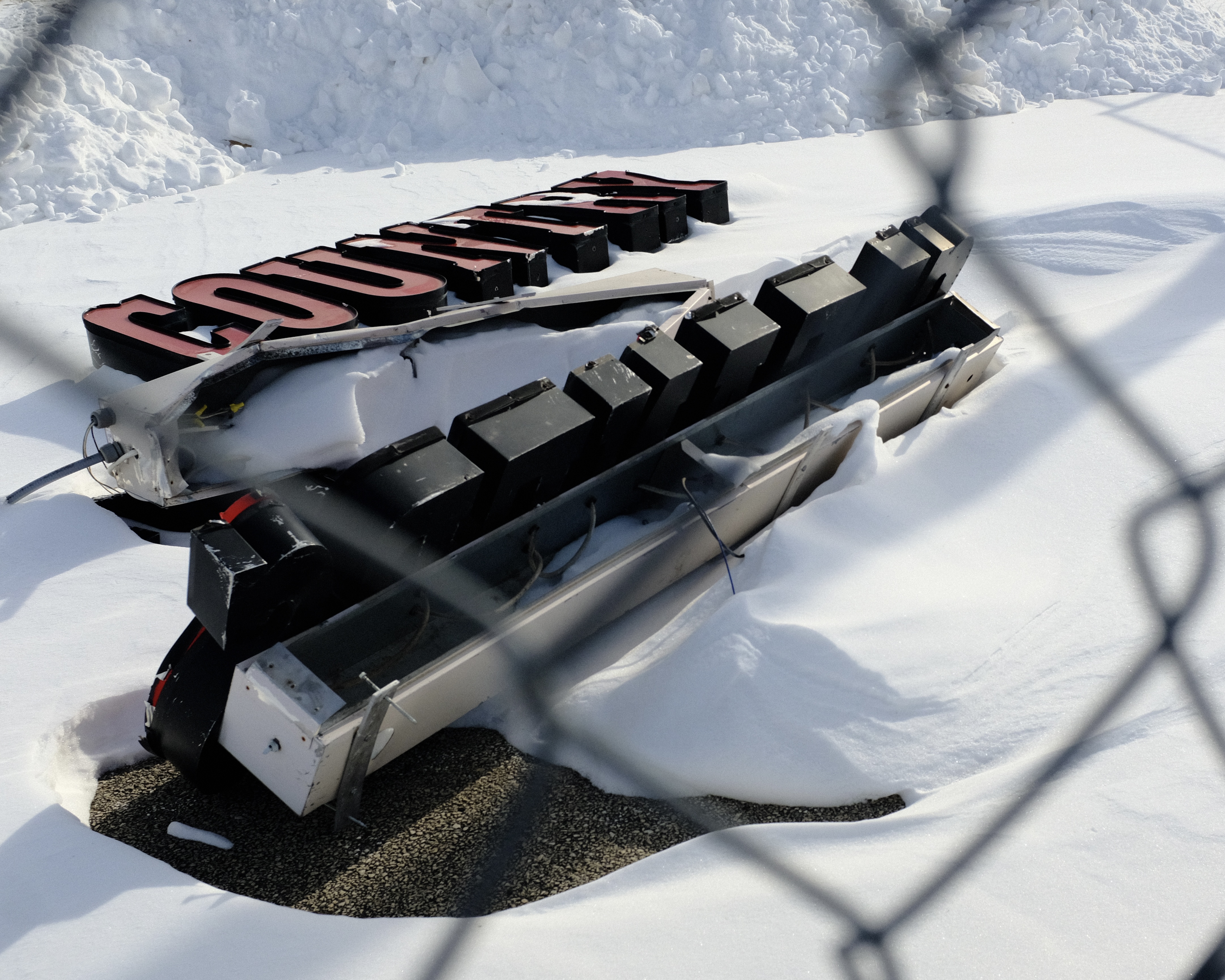color photograph of discarded storefront letters sitting in the snow, viewed through a chainlink construction zone fence. the word “country” sits atop fresh snow, with the backlighting electrical components sitting askew below it. nearby, another set of letters and its lights sit against a snowbank, turned away from the camera.