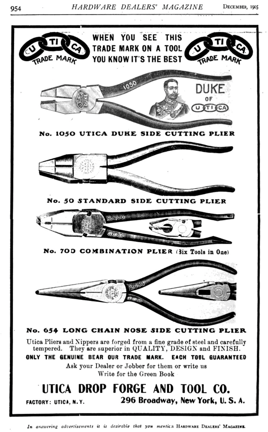 An early catalog illustration, probably a photo engraving, of different kinds of wrenches with the brand name "Duke of Utica," which is fun to say and feel the words shape your lips and send your tongue ricochetting off your palate and teeth.