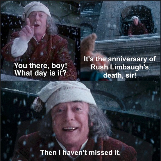 second panel shows a wider shot from below, showing more of the building and window of a stone building with snow on a ledge. it is clearly snowing. there is the back of a rabbit visible looking up at michael caine. the caption reads "It's anniversary of Rush Limbaugh's death, sir!"