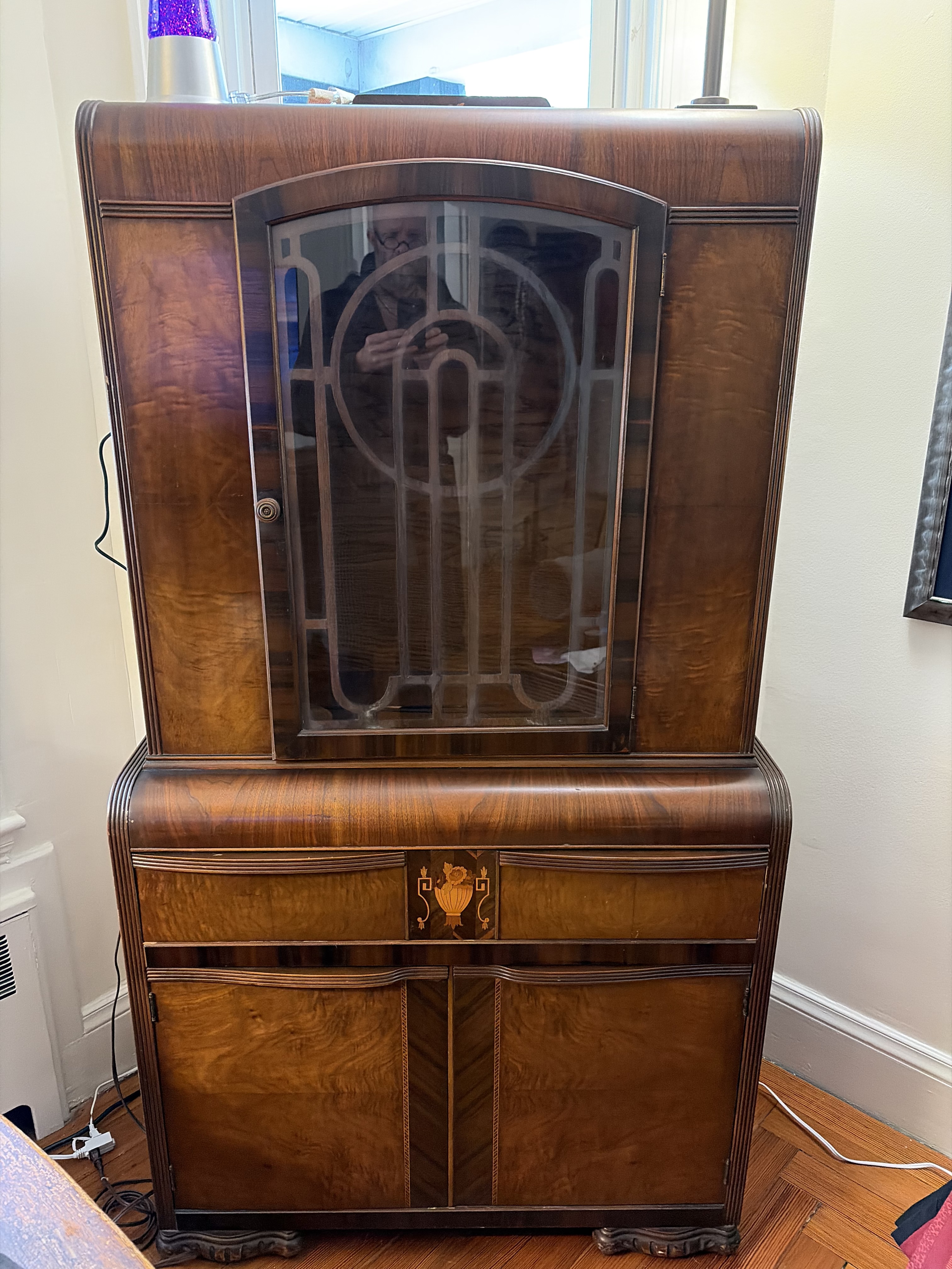Because moving my stuff back from Chicago wasn't enough of a workout, *while we were in transit* from the midwest she found this set with a very motivated dealer behind it. We got this piece, a sideboard and a table and chairs for $500, delivered.