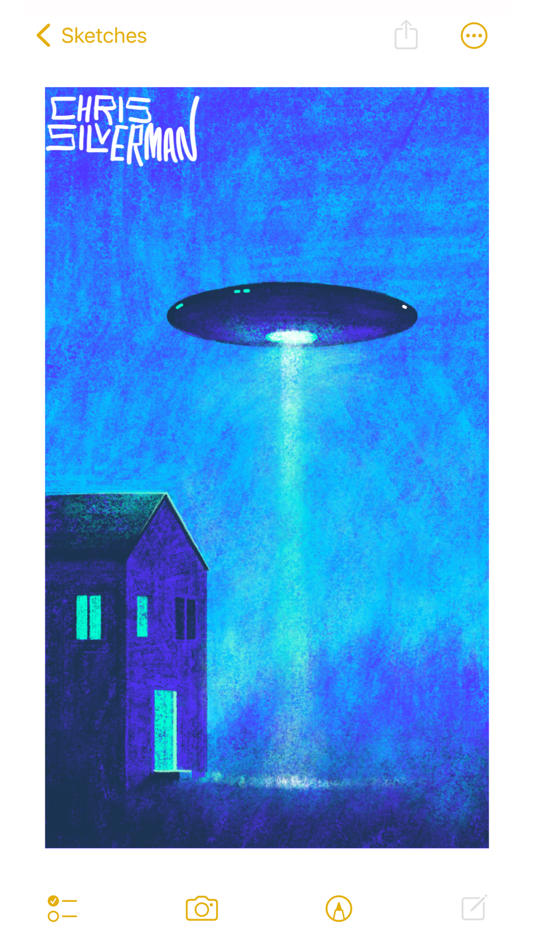 A clear evening. The sky is an indigo blue, and clear, except for a large black flying saucer hovering overhead. A greenish-white beam of light extends from the underside of the saucer to the ground. The saucer is hovering over a house. The door to the house is open, green light spilling onto the grass, but no one is visible. Several of the windows are also lit with greenish light. In the background is a purple blur of trees. The painting is signed "Chris Silverman".