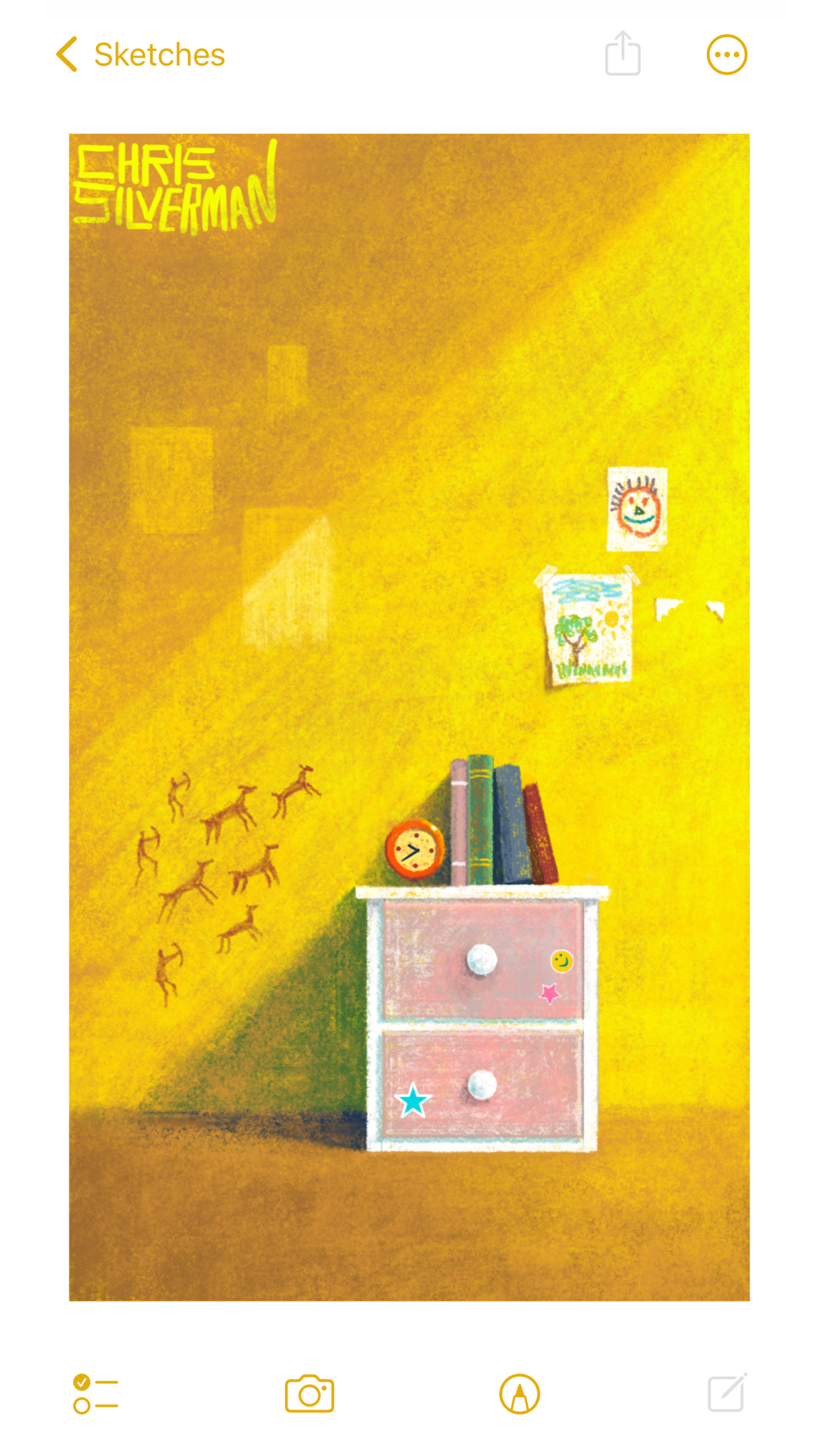 A room that looks like it may have belonged to a child at one point. It appears abandoned now: almost nothing hanging on the walls, and no toys on the floor. There's a white dresser with two pink drawers, and a few books and a red clock on top of it. The drawers have a few random stickers: stars, a smiley-face. The wall is bright yellow, with long shadows suggesting it is drenched with sunlight. The dresser casts a long, greenish shadow as well. There are a few faded patches where pictures once hung. Still taped to the wall are two rough, crayon drawings of a face and a tree. Also drawn on the wall are some red sketches that do not look like they were drawn by a child: several running animals and figures with bows and arrows that look like those seen in cave paintings. The floor is a light tan color. The painting is signed "Chris Silverman".