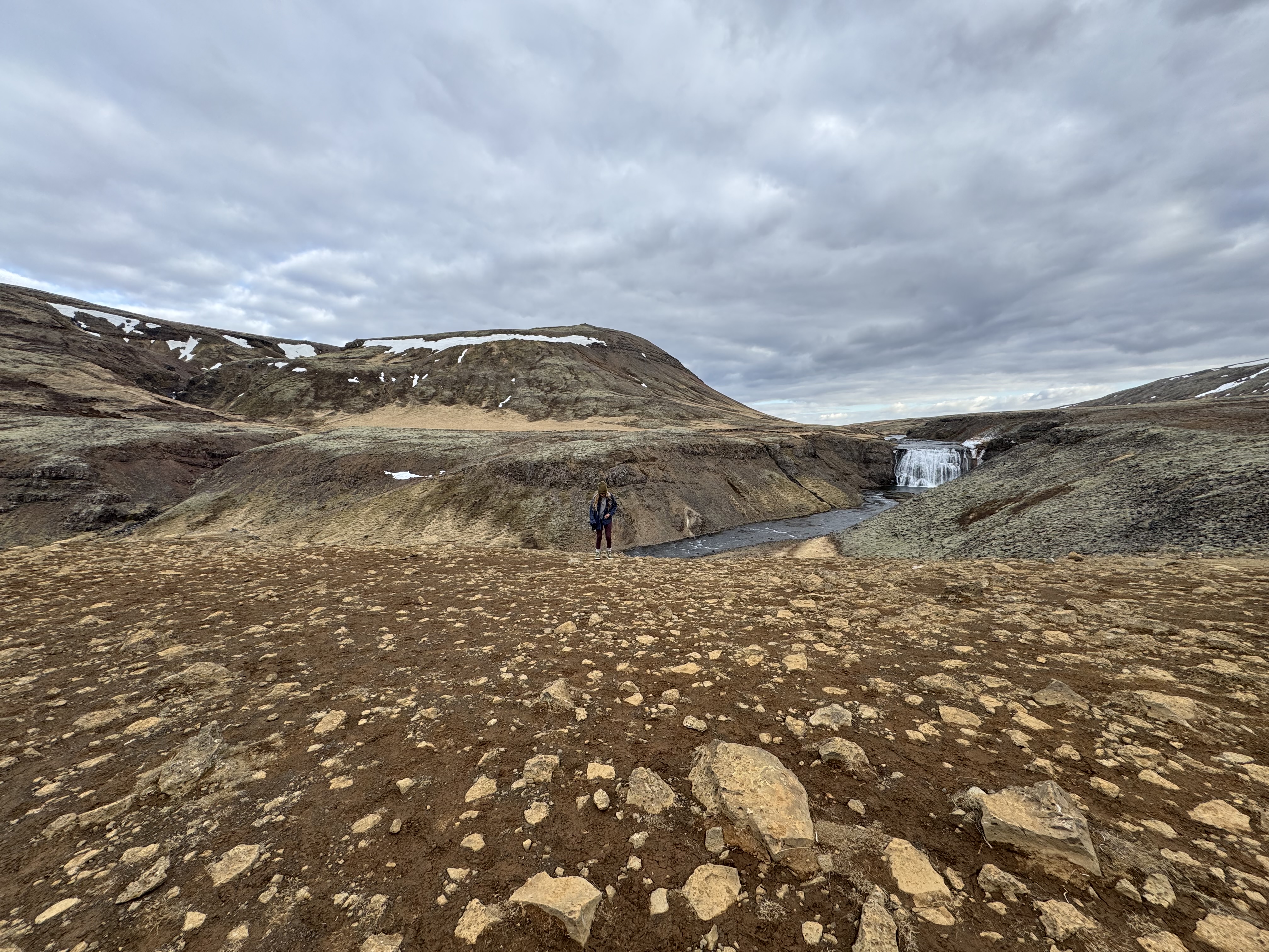 A wide-angle shot of a rocky terrain in Iceland, with my wife appearing in the distance in the center of the image, and a waterfall far away to the side, with dramatic textured clouds covering the sky.