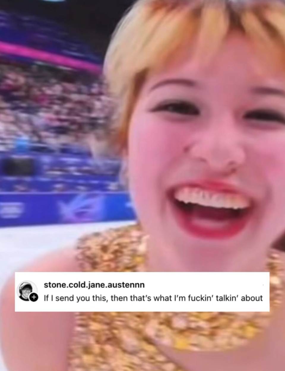 a screen capture of Alysa Liu's smiling face right after her performance when she looked right into the camera and said "that's what I'm fuckin' talkin' about!" and in the foreground is a post from stone.cold.jane.austennn that says "If I send you this, then that's what I'm fuckin' talkin' about"