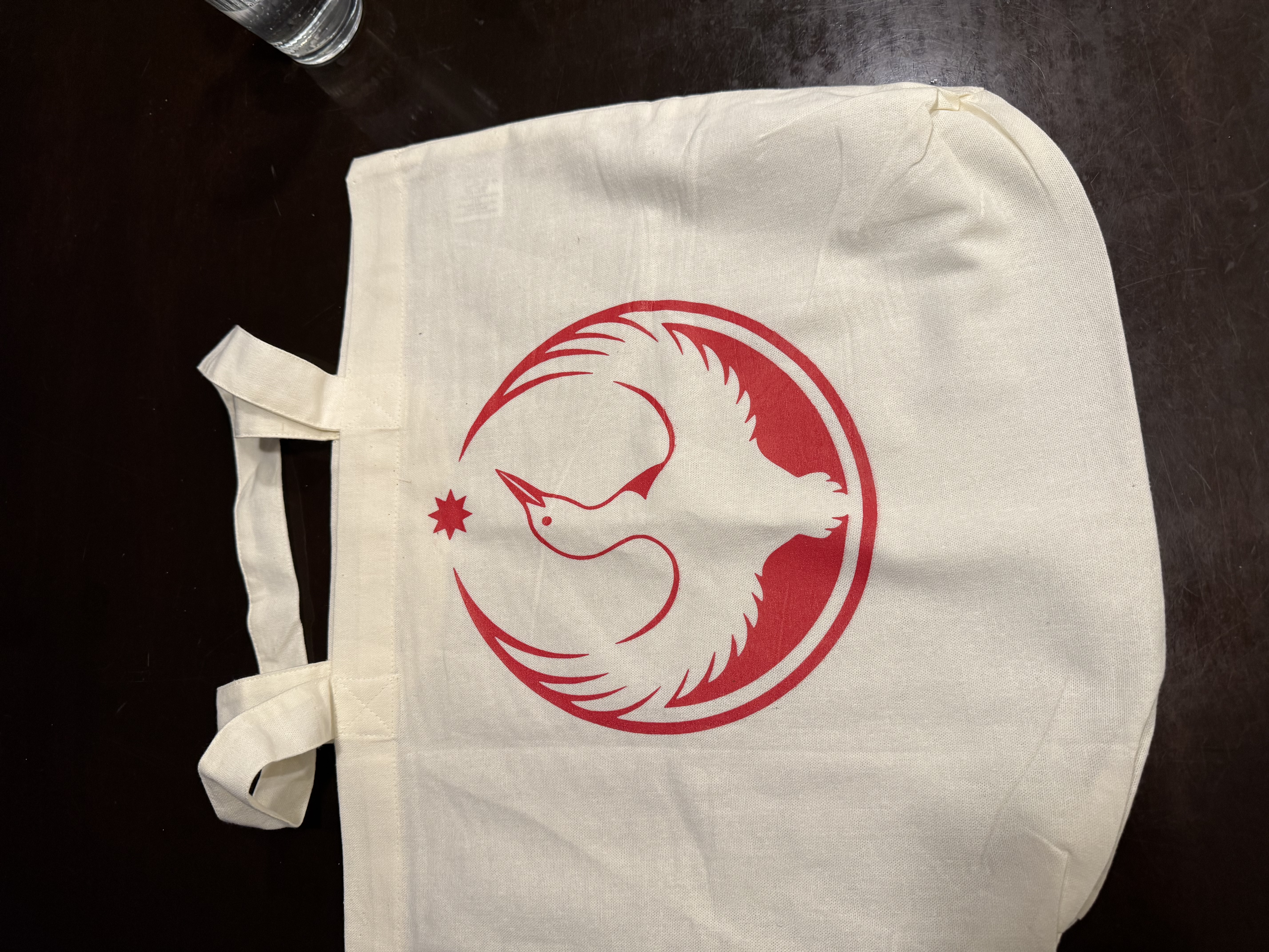 A beige tote bag with the Rebel Loon insignia, a mashup of the Star Wars rebel insignia and the state bird of Minnesota, in red ink. The loon’s wings make a circle with the tips at the top, pointing to an eight pointed star. The head of the loon is angled toward the top right.