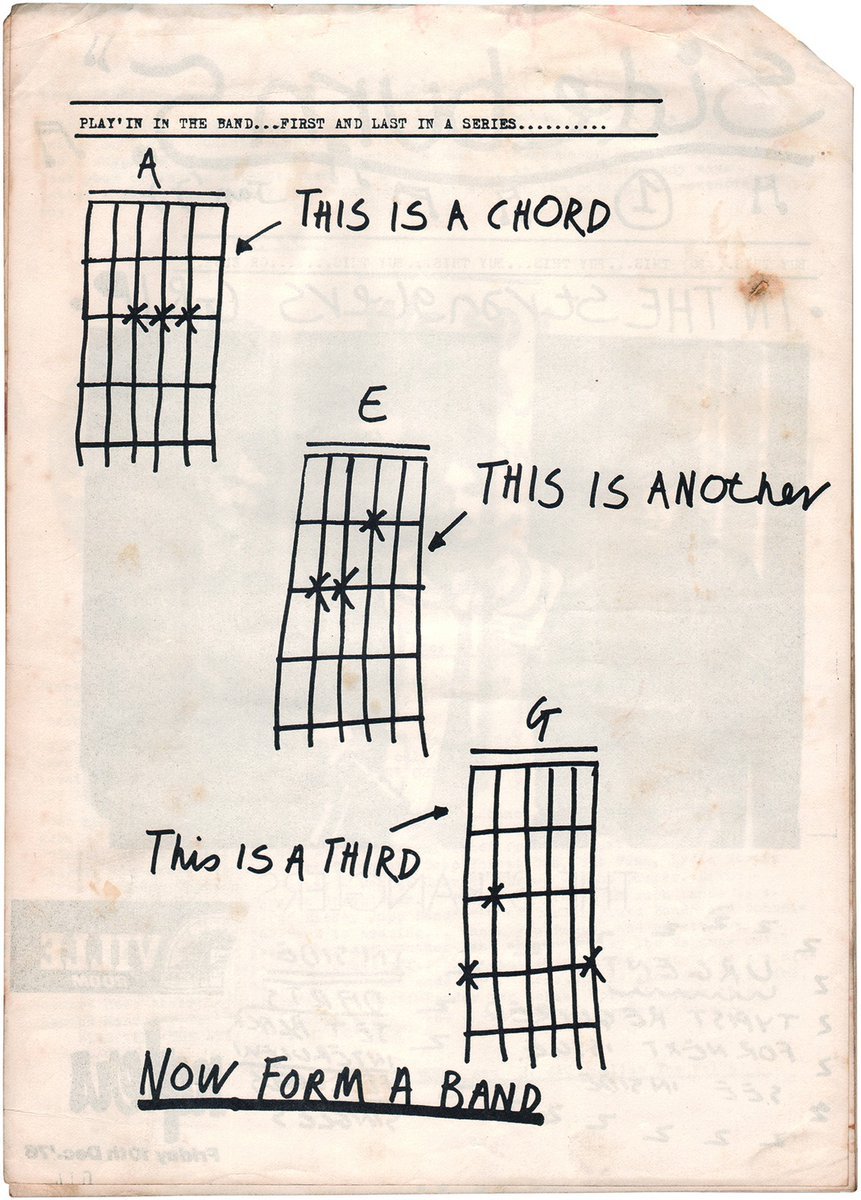 "'There’s an illustration from a fanzine called Sideburn #1, which was a drawing made by Tony Moon just to fill the space. It’s a drawing of three guitar chords and it says, "now form a band". That fanzine is extremely rare, but the drawing is often quoted by lots of musicians as the impetus to do something, and it’s seen as a key message of punk,' says Toby. 'You didn’t need to have been to music school or be particularly proficient or skilled. It was much more about the energy and drive to do something. It’s a rallying call to the troops.'"