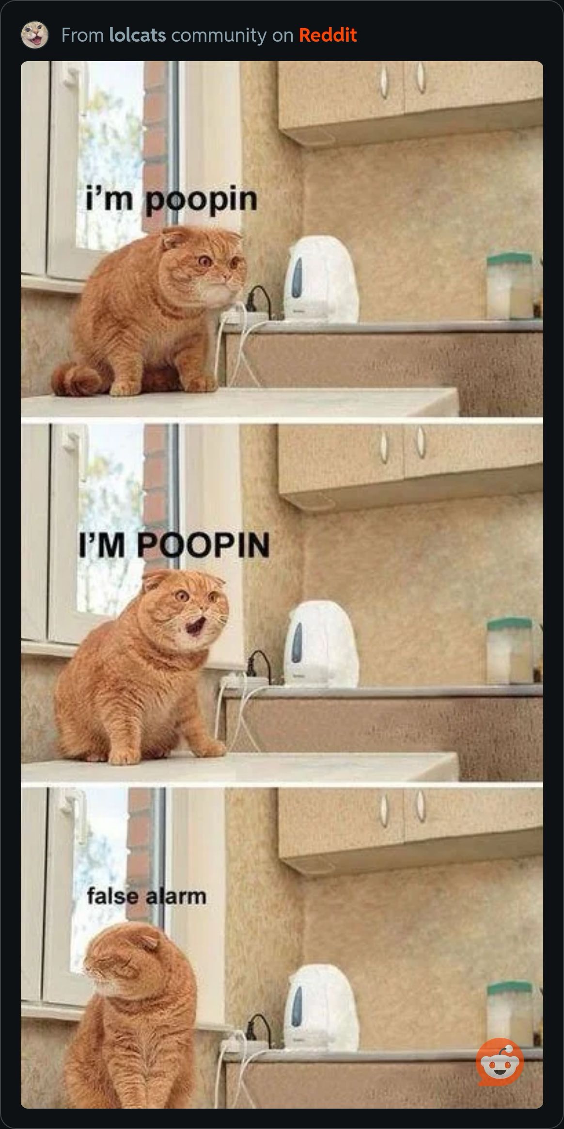 panel one: an orange cat with scrunched up face says “i’m poopin”