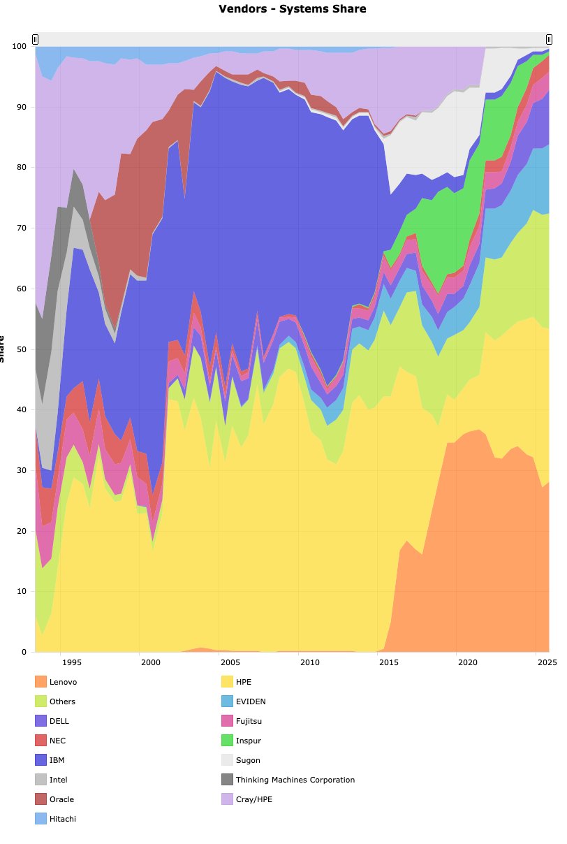 a color stacked area chart, represnting the share of supercomputers on the TOP500 list over time. the x axis covers the time between 1994 and 2025; the y axis denotes share percentage. below the chart is a color key denoting the vendors, which includes (left column: lenovo, an "other" category, dell, NEC, IBM, intel, oracle, hitachi, (right column) HPE, EVIDEN, fujitsu, inspur, sugon, thinking machines, and cray/HPE