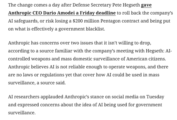 paraphrasing a comment i saw elsewhere, he wants a model he can control and block from refusing unlawful planning scenarios and acts of war.