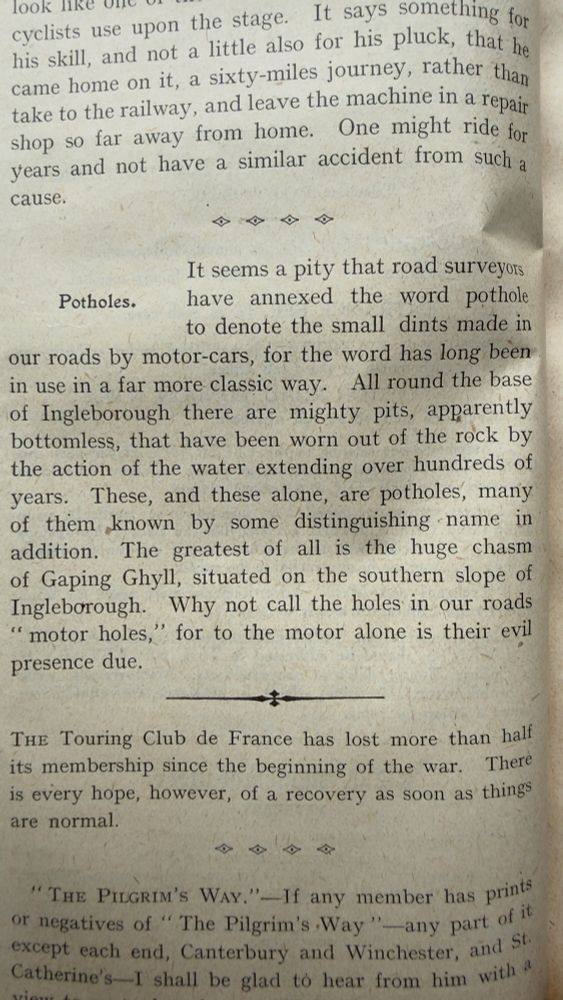 POTHOLES: It seems a pity that road surveyors have annexed the word pothole to denote the small dints made in our roads by motor-cars, for the word has long been in use in a far more classic way. All round the base of Ingleborough there are mighty pits, apparently bottomless, that have been worn out of the rock by the action of the water extending over hundreds of years. These, and these alone, are potholes, many of them known by some distinguishing name in addition. The greatest of all is the huge chasm of Gaping Ghyll, situated on the southern slope of Ingleborough. Why not call the holes in our roads "motor holes," for to the motor alone is their evil presence due.