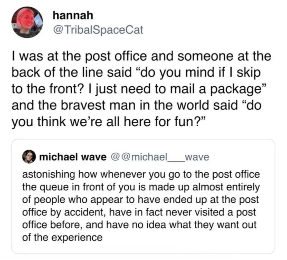 @dad As somebody who, until recent government made it unfeasible, would be periodically mailing packages internationally, I can say that the staff at some post offices are very good at their jobs, the staff at other post offices are not, and when you live where you can choose which post office to go to you find out that everybody who's serious about mailing things all congregate at the post office where the staff are good at their jobs so you have a long queue that moves fairly quickly, and you avoid the post office where the queues are not long but move very slowly.