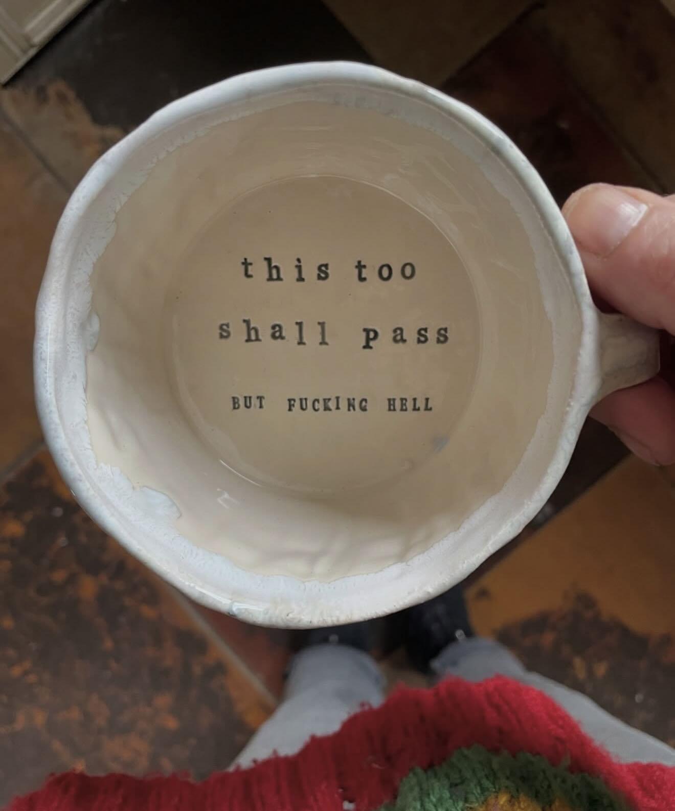 I initially read that as "this poo shall pass" which being at the bottom of a coffee cup is funnily deterministic to me.