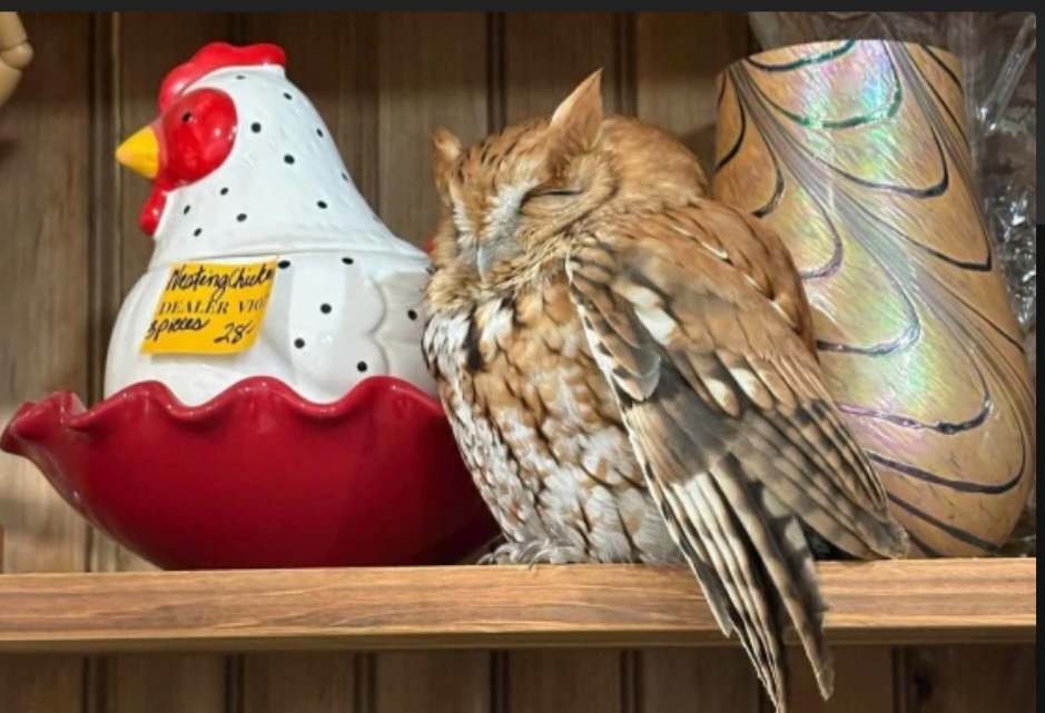 An owl, napping in an antique shop, was sent back out into a winter woodland, by rescuers. No one knows how the owl got into the store. Shoppers initially thought it to be a taxidermy exhibit. I note, the vase behind them has woodland overtones.