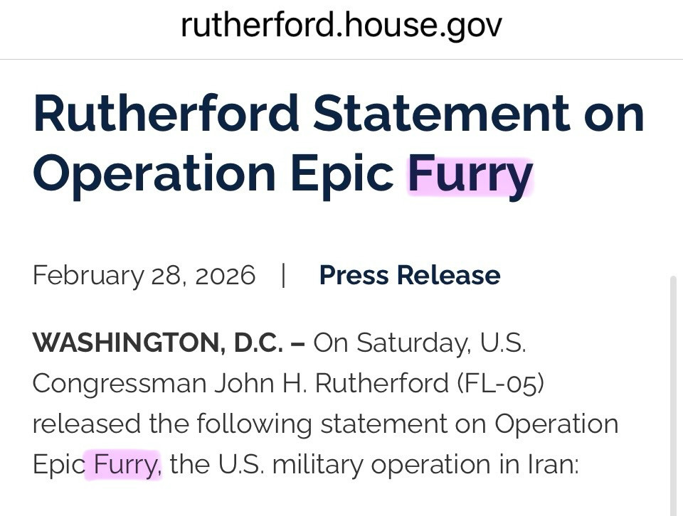 Congressman John H Rutheford released the following statment on operation epic furry, the u.s. military operation in Iran.