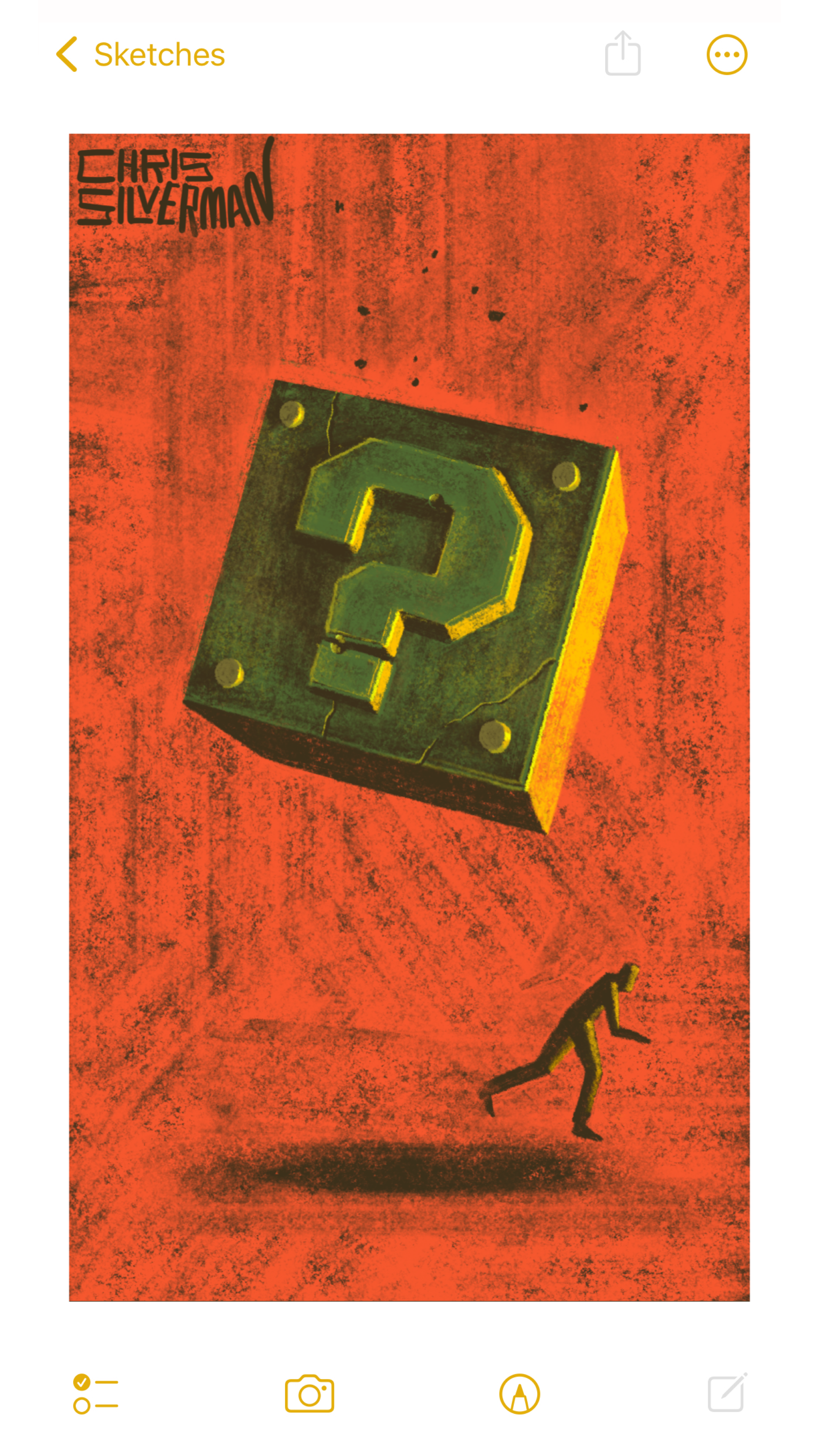 A bright red-orange background. Falling from the sky like a safe tossed off a skyscraper is a large, brass-colored cube that looks like it is made of metal or stone. Embossed on the slightly cracked front is a chunky question mark with four bolts around it, like the question boxes in the Mario universe. It is, judging from the size of the person running away from its anticipated point of impact, the size of a small house. The painting is signed "Chris Silverman".