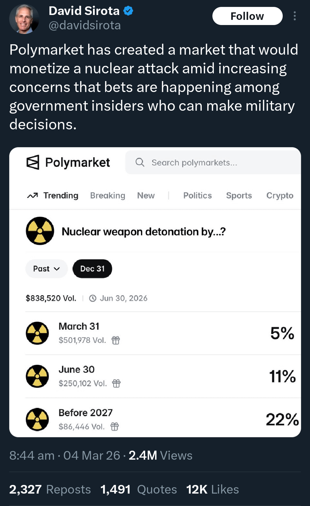 I would bet that one 'government insider' would be ecstatic to see the world end as long as he had the most money at the time...