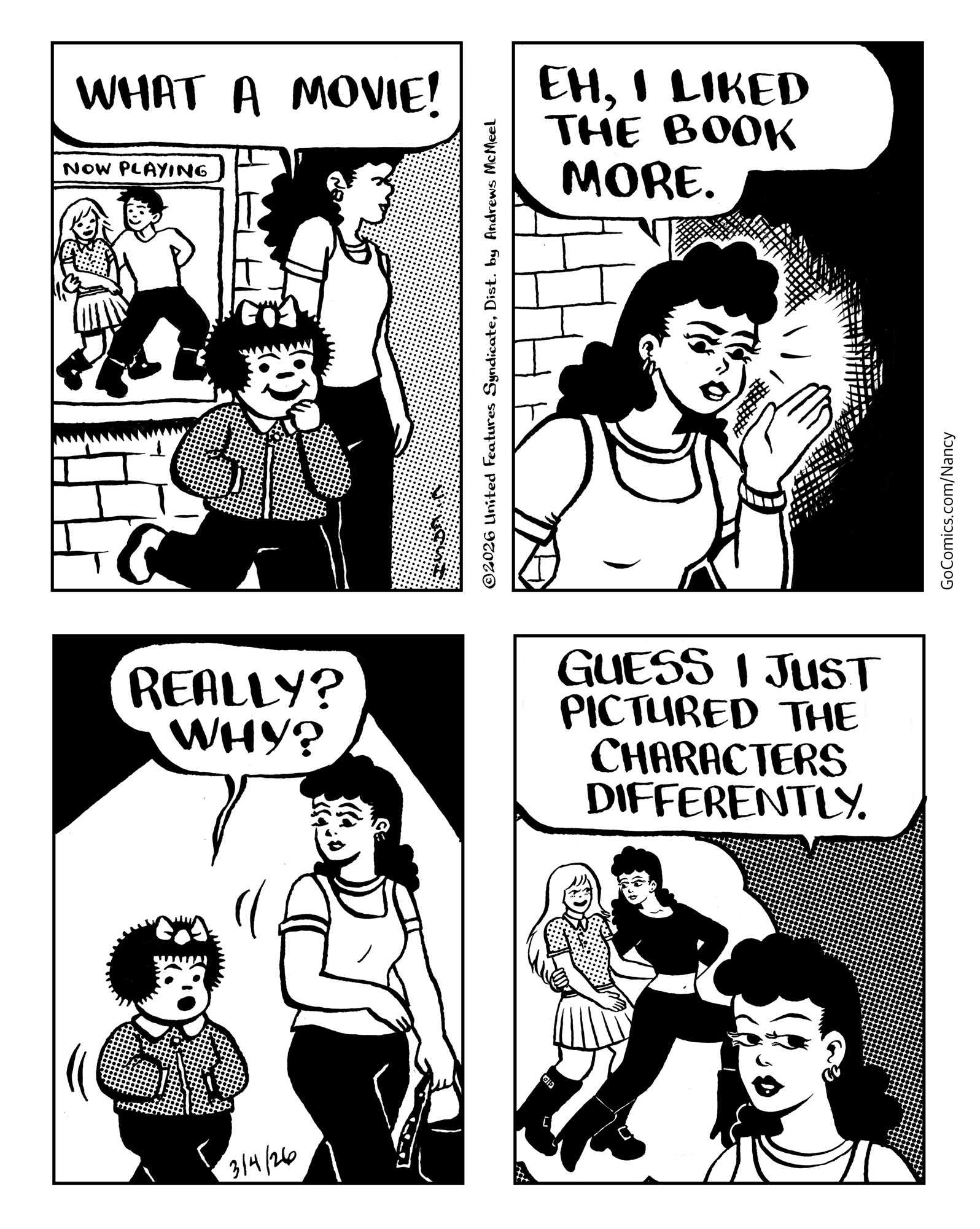 first panel shows Nancy with her typically spiky hair and bow, a sweater and black pants and Fritzi, a tall woman with long curly black hair, a tank top, black pants and wearing an upper arm band. They are walking in front of a brick wall that has a movie poster that shows a woman in a polka dot dress dancing with a man with black pants and white shirt. Nancy says "what a movie!"