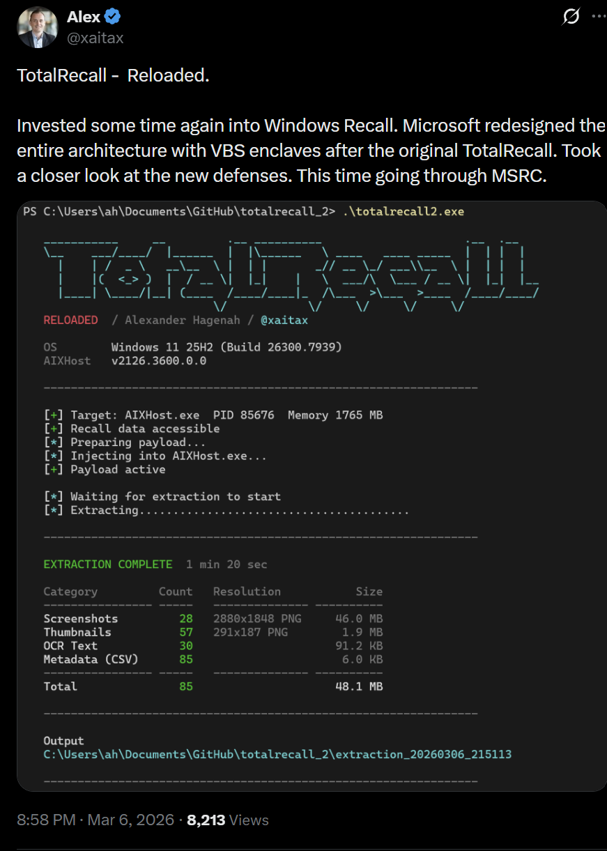 So @xaitax has cracked Microsoft Recall, he's got access to the encrypted database and has automated dumping of screenshots and all text from screenshots.
