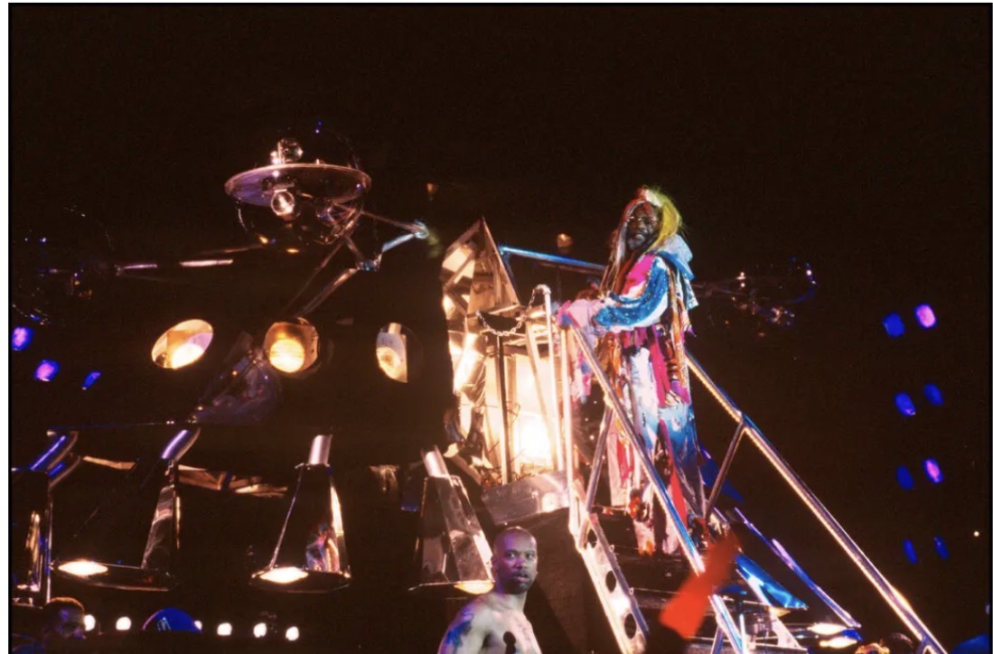 A Black man in iridescent magenta and turquoise jumpsuit dripping with plastic silver fringe mounts the chrome staircase of a shiny pyramidal metal spaceship-like stage prop with glowing yellow circular portholes