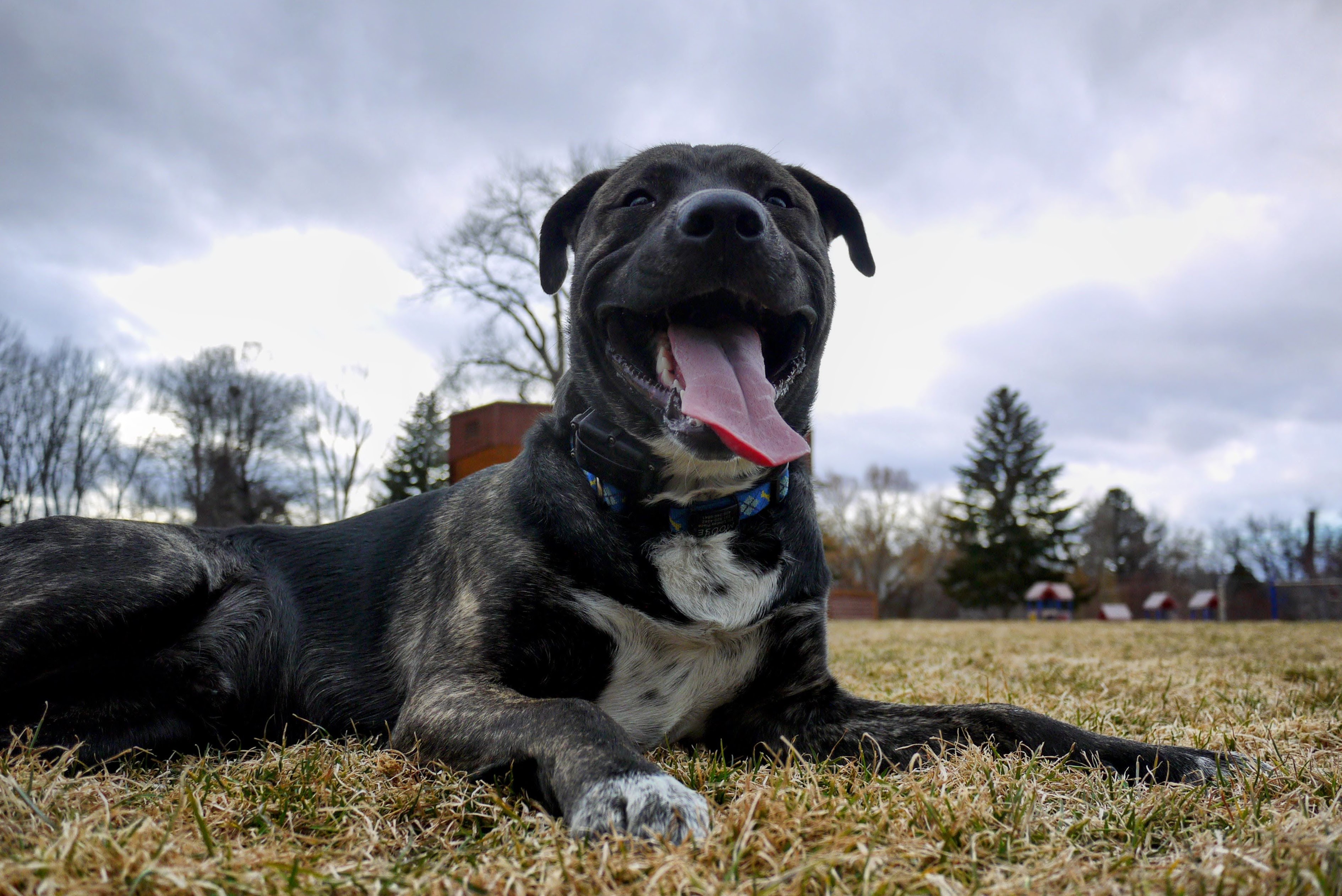 A gorgeous big boi doggo named Moose lols about in a park with his tongue hanging out on full display.