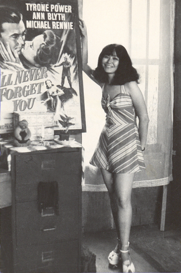 A black-and-white photograph. A smiling young woman with shoulder-length dark hair, wearing a stripy halter dress, stands in an office next to a framed poster of Tyrone Power's "I'll Never Forget You".