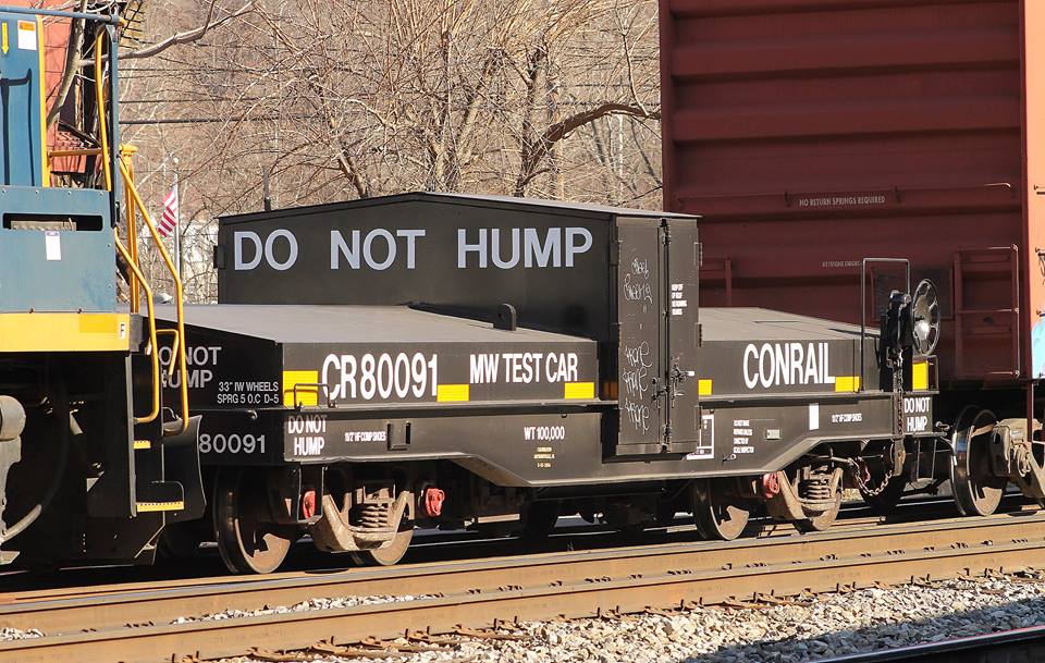 Photo of a low-slung railroad car with a gabled top, labeled "MW Test Car". Across the middle is a taller block with doors on the side, marked "Do Not Hump" in large block letters. If it was attached directly to a locomotive it would be difficult for the engineer to not read it. To drive the point home it is repeated in smaller letters on every other surface.